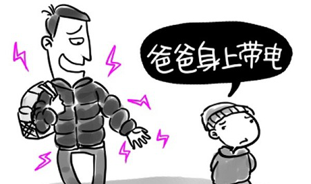 其实,静电并不是人体产生的,而是人在活动时因摩擦而产生的,在空气干燥的情况下更容易产生。冬天衣服穿得多,而且以羊毛料子更为常见,衣服之间相互摩擦产生了大量的电荷,在空气干燥(当空气湿度长期低于40%)的情况下,这些电荷没有途径释放掉,积累在衣物表面,当人体所带的静电荷产生的电压越来越高,就容易被“电”到——手指刺痛。
